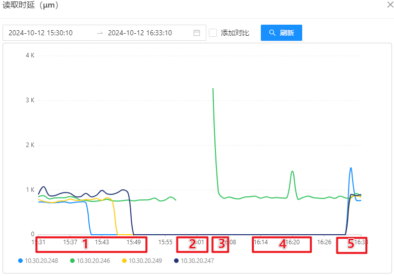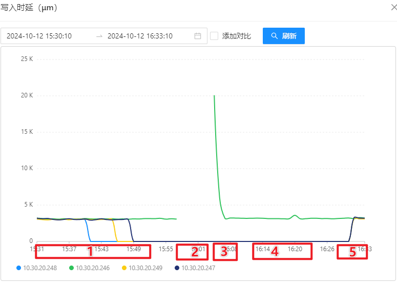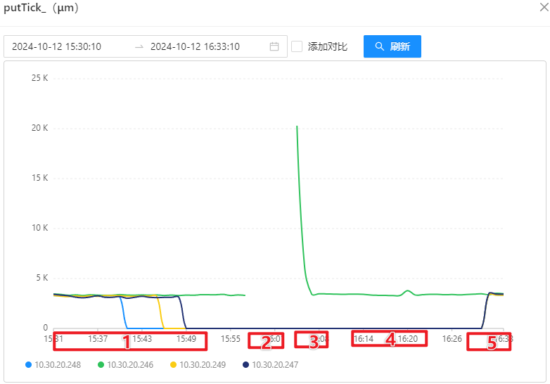 - 第二阶段:关停 10.30.20.246 上的 OSS-Mongo,此时所有 8 台 Store 的双跑发送消息会失败,并存储等待连接回复后进行消息恢复;